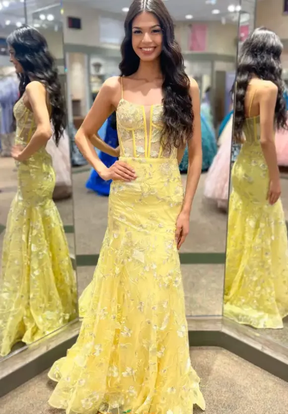 Feel and look elegant when wearing this long fitted dress by Jovani, style 38004. Featuring a scoop neckline with delicate straps that leads to a beautiful back zipper closure. Showcasing a stunning fitted see through corset top that will for sure hug your waist gorgeously, meanwhile the bottom flares out beautifully. This ensemble has unique bead work, floral embroidery and sequins throughout the dress. You will for sure look like a princess.