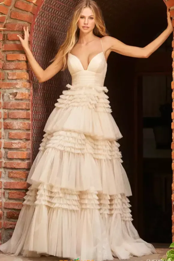 Feel like a modern day princess and show up to your social occasion in this amazing Sherri Hill ball gown 54845. This tulle ensemble showcases a unique tiered design that will be sure to make an impression. The bodice has a v cut neckline with thin straps that wrap into a zipper back closure. Show off your gorgeous matching heels with the side front slit.