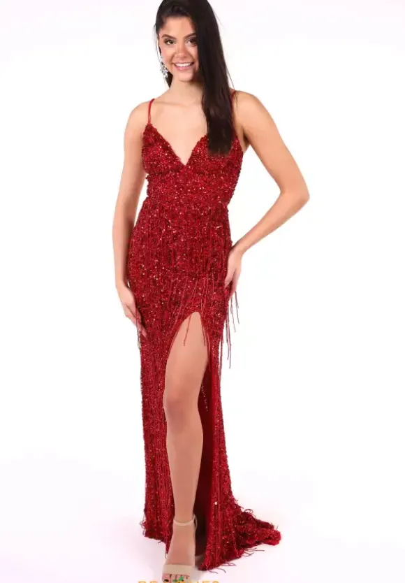 Set the trend at your next event when strutting in with this astonishing fitted style 55041 by Sherri Hill. The astonishing dress features a slight v neckline and is paired with a double spaghetti with one strap tieing into the corset lace back. The full gown is decked out with sequin and is paired with fringe hanging offering up a more chic approach.