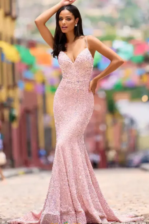 Twinkle perfectly all night long with this one of a kind fitted Sherri Hill style 55091. The flattering dress features a v neckline that is supported with a double strap, one leading into the corset lace back. Made in a velvet and sequin combination that will have you feeling like a trendsetter as you make your entrance.