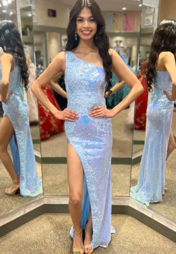 Walk in with confidence wearing this chic long style 55311 by Sherri Hill for your next event. Headlining the asymmetrical neckline paired with gorgeously place applique to decorate along the bodice and lines the high slit to the bottom of the dress. Fully adorn in glitter sequin to have you glistening wonderfully all night long.