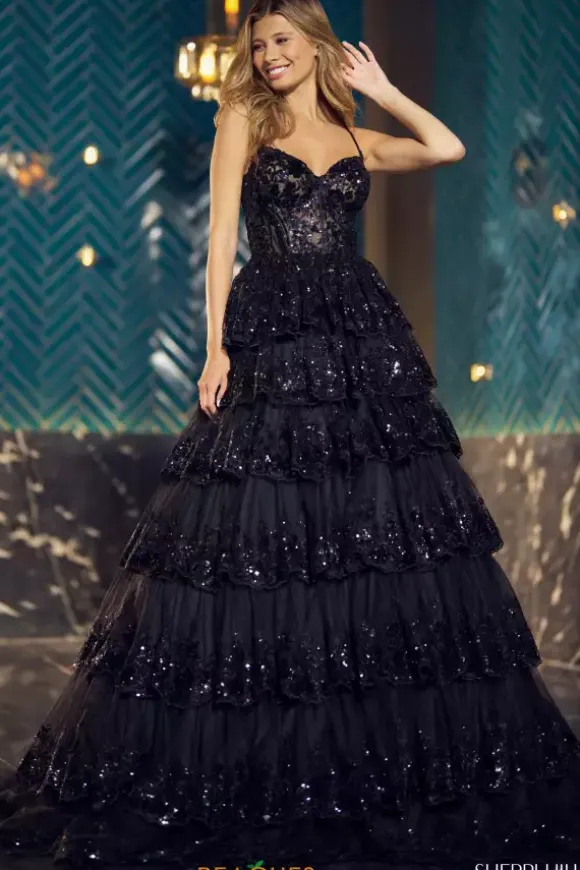 Look like a modern day princess in exquisite dress 55925 by Sherri Hill. This stunning dress has an A line silhouette and features a fitted corset bodice adorned in shimmering lace and appliques that are featured on each hem of the ruffled tier skirt. Make a remarkable exit with the stunning sweep train.