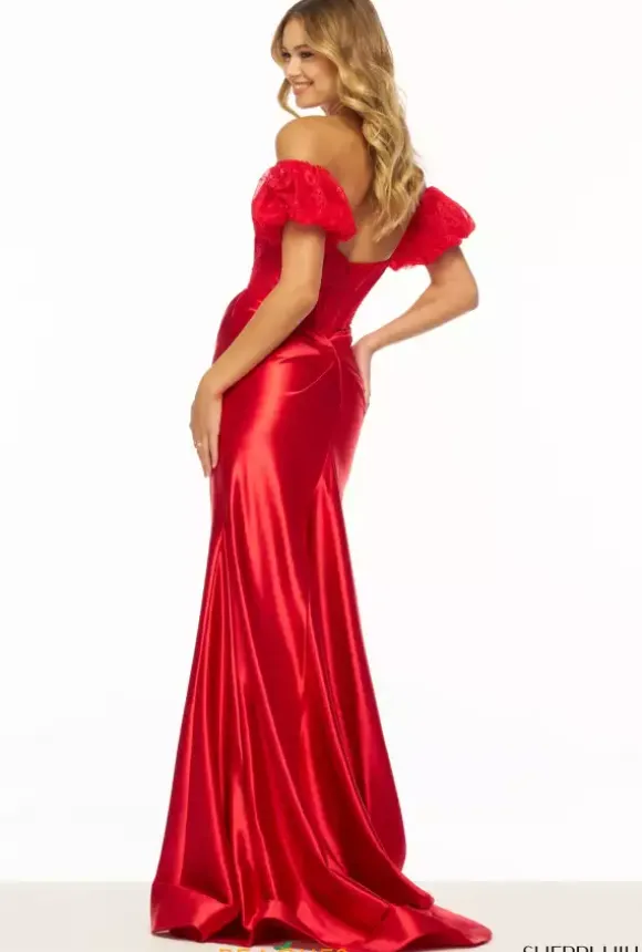 Fun and flirty Sherri Hill style 56166 features a vibrant lacey bodice with chic corset boning, glistening beading details, and a classy deep V plunge with a mesh covering. Featuring a strapless sweetheart neckline elevated with super cute puffy cap sleeves. A stunning stretch satin skirt flows elegantly, complete with a side slit and train.