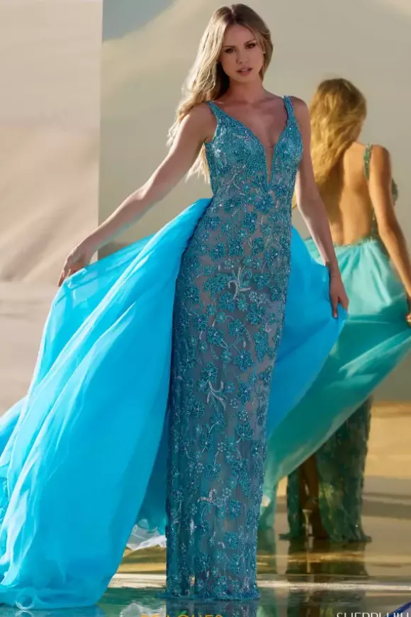 Make a show stopping appearance in this glamorous fitted gown by Sherri Hill 56390. Featuring a low v cut neckline and thick supportive straps that create a low open back. Fitted silhouette is fully adorned in a shimmering beadwork to really have you stand out. A dramatic overskirt train is added for that extra touch of glam.