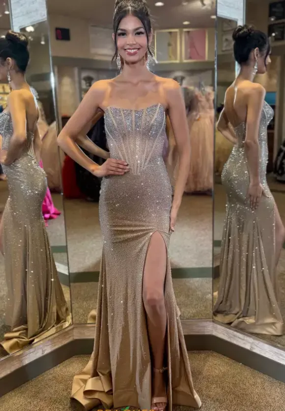 Astonish the crowd at prom in this sensation al long fitted Sherri Hill gown 57414. Showcasing a strapless sweetheart neckline, shimmering stones adorn the entire silhouette for the perfect pop of sparkle. The alluring sheer corset bodice defines your curves highlighting your natural figure. Made in a jersey fabric, the long fitted skirt features an appealing slit and glamorous sweep train.