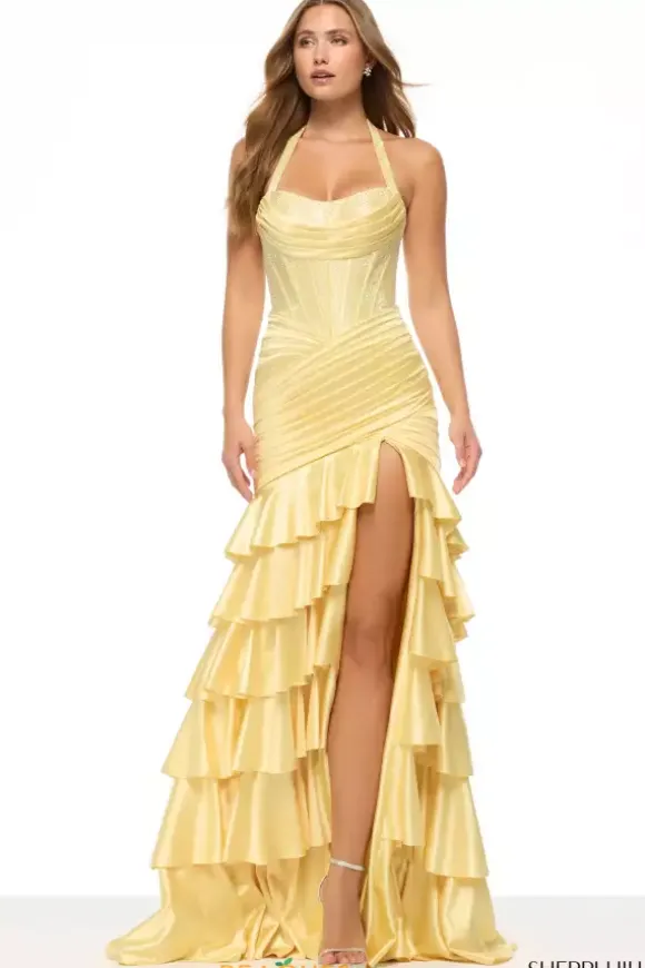 Step out of your comfort zone when you wear this fascinating fitted dress by Sherri Hill style 57702. This timeless dress features a halter scoop neckline that cascades into a lace up open back as well as a corset. The dress is made from stretch satin and the bodice is decorated with beading. The skirt has a ruffle pattern and a slit with a train.