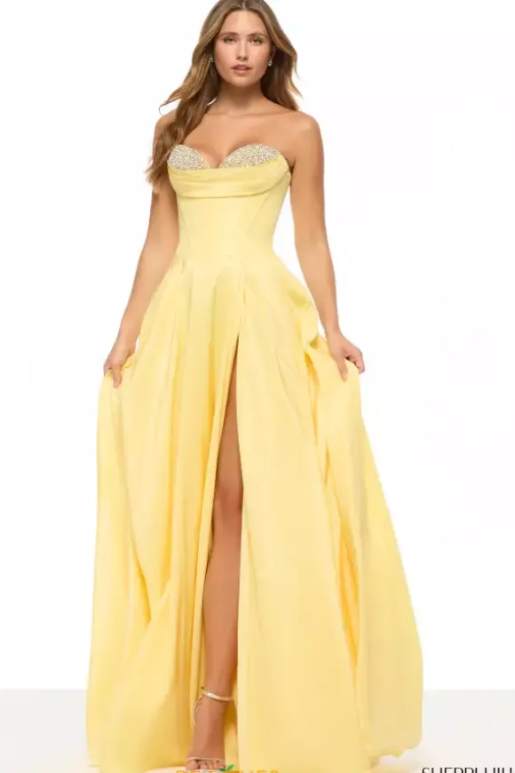 Make a memorable entrance at prom wearing this tremendous taffeta Sherri Hill long dress style 57747 offered in lux color choices. This impeccable gown features a strapless bodice with a sweetheart neckline with pleating and peek a boo beading, visible boning and low zipper back. The long a line skirt has a crossover front slit and back sweep train.