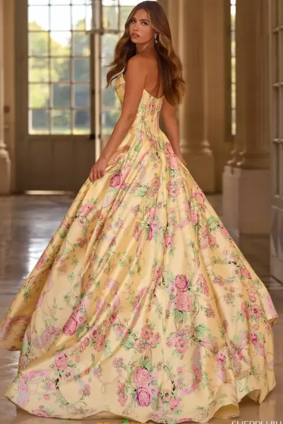 Radiate like the sun in this ultra fresh Sherri Hill long dress style 57797 made in a sensational satin garden floral print. This brilliant gown showcases a structured, strapless bodice with a scoop neckline with pleating and zipper closure back. The long, full ball gown skirt has an edgy front slit, horsehair hem edge and back sweep train.