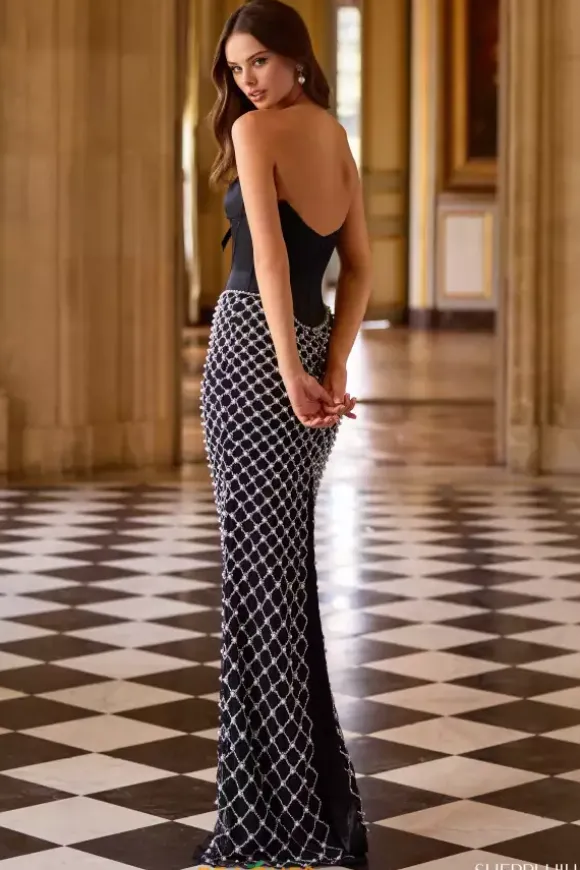 Be the hottest topic in this chic closed skirt Sherri Hill fitted prom dress style 57829. The elegant form fitting satin corset ensemble displays dainty beadwork across the strapless bow embellished v-neckline and intricate pearl beaded crisscross patterns that dazzle radiantly throughout the sweep length skirt.