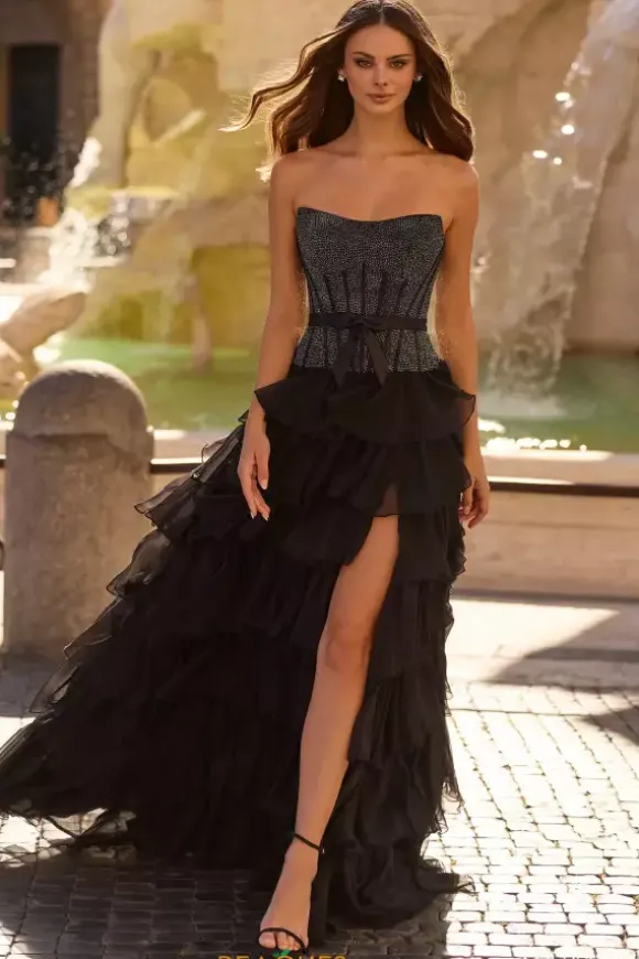 Have a major fashion moment in this long A line dress by Sherri Hill, style 57891. This ensemble showcases a strapless scoop neckline and structured corset. This bodice is beautifully beaded and has a one of a kind bow in the center. The chiffon ruffles gives the skirt a voluminous look and gracefully flows into a train. Complete this look with a lovely slit.