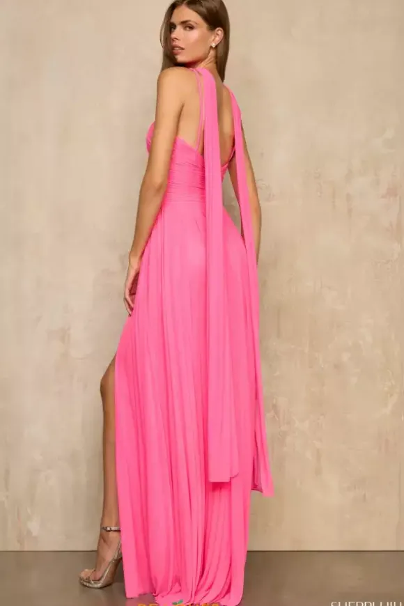 Less is more when you are wearing this striking Sherri Hill flyaway sweep train gown style 57970. Choose the color of your choice and stand out with a knot detailed halter neckline with a dainty keyhole cutout to amp up the sexy factor on the ruched bodice. The lengthy skirt has a discreet thigh high slit.