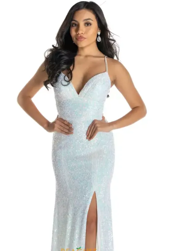 Sparkle and shine at your senior prom in this dazzling Sherri Hill prom dress 80110 decadently embellished with lines of glistening iridescent sequins. This smashing gown showcases a fitted bodice with a V neckline, spaghetti straps and an open lace up tie back. The long form fitting skirt has a sultry high front side slit and back sweep train. See more of the amazing Sherri Hill collection at Peaches Boutique. Please note the IVORY is both Ivory and silver beading.