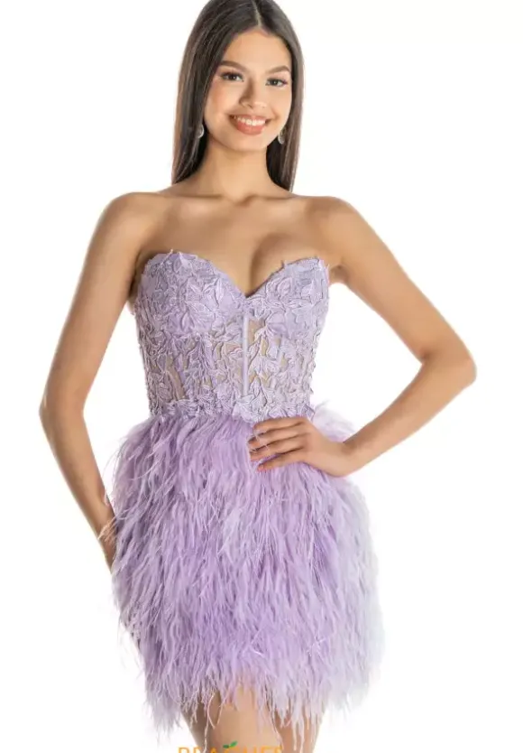 Make a glam entrance with this show stopping short Sherri Hill style 55179. This timeless ensemble showcases a strapless sweetheart neckline with structure boning of a corset that accentuates your figure naturally. The slim fitted skirt is adorned with soft captivating feathers to dramatize your look.