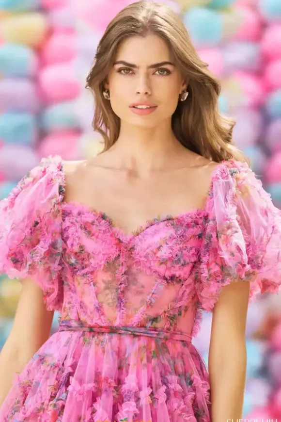 Sweet and sassy is what makes this Sherri Hill short dress a must have for your next special event. The strapless sweetheart neckline showcases poet off the shoulder cap sleeves. Sheer illusion adorns the bodice with exposed boning detail. Layers of printed tulle give this short dress the perfect amount of fullness.