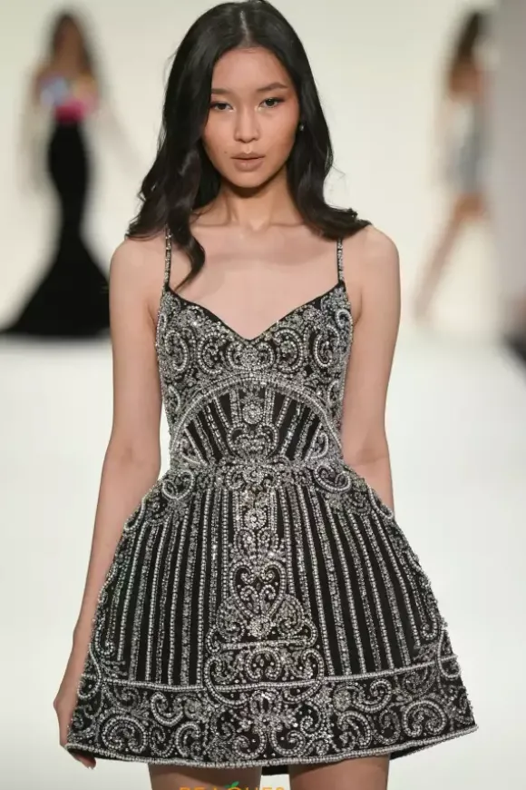 Shimmer and shine from any angle when you wear this extravagant short A line dress by Sherri Hill Short style 57279. Featuring an alluring v neckline that is followed by two straps for support and elegance. The tasteful dazzling beadwork will catch the attention of the light to have you shimmer all night long.