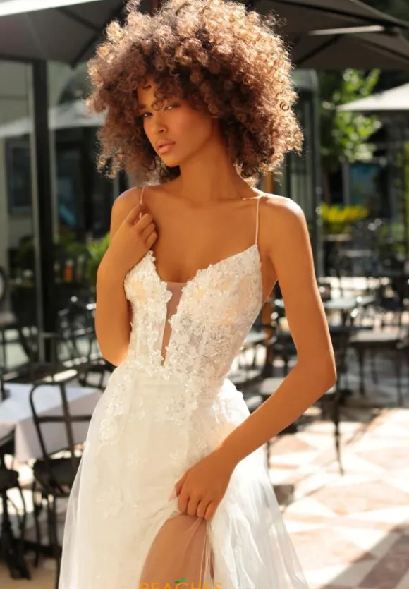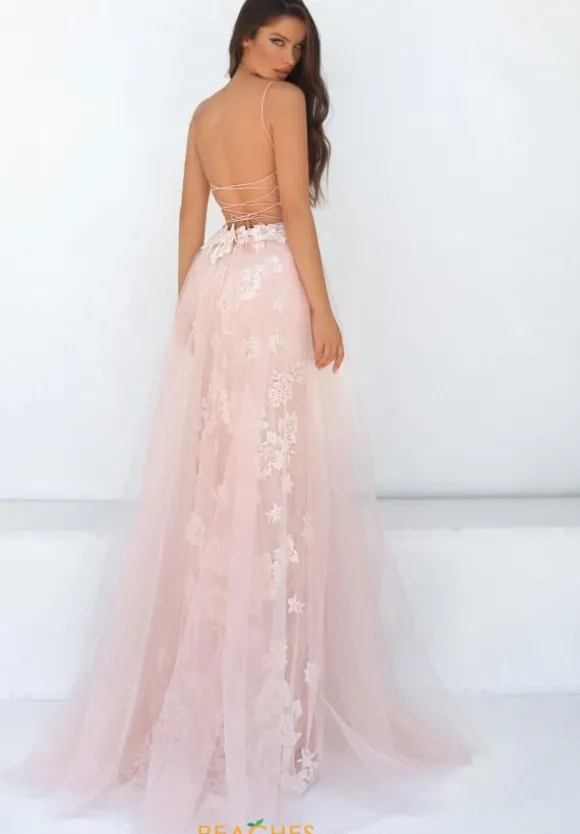 Walk in with elegancy wearing the Tarik Ediz long style 51031. Having a flattering v neckline and a fitted bodice that will hug you wonderfully. Adorned with applique that continues along the small of the back and on the fist layer of the tulle skirt. Headlining the Spaghetti straps that fall onto the back and continue the lace up of the corset bodice to naturally draw in the waistline.