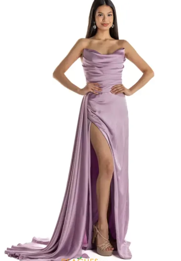Flourish in a beautiful satin design by Tarik Ediz style 51144. Nipped in a draped bodice and soft pleats, this dress displays a cowl neckline on a strapless silhouette. The stunning and sheath skirt opens up with a high thigh slit, complemented by a draping cascade detail from one side and a gorgeous sweep train to elevate your style factor for the evening.
