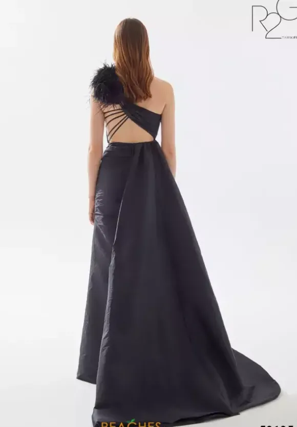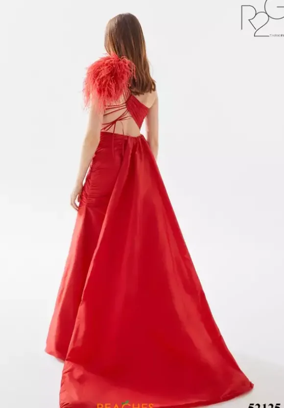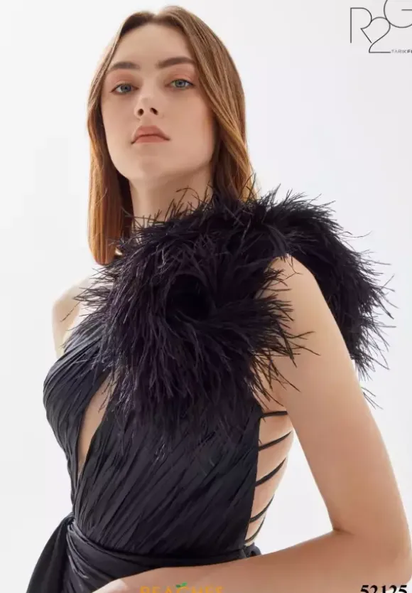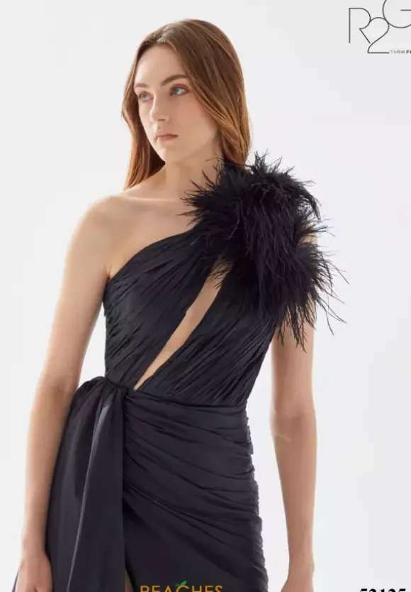 Show off your dramatic side in fierce taffeta dress 52125 by Tarik Ediz. This A line dress features a single shoulder asymmetrical neckline with a dramatic feather embellishment on the shoulder. A taffeta drape cascades from the small of your waist and adds drama to the thigh high slit and sweep train.
