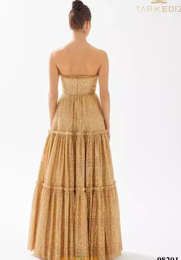 Show off your elegant side in stunning gold dress 98201 by Tarik Ediz. Figure flattering and one of a kind, this gold ball gown dress accentuates the small of your waist and features a strapless sweetheart neckline along with a voluminous skirt that is adorned in ruffled novelty details that give off elegant detail.