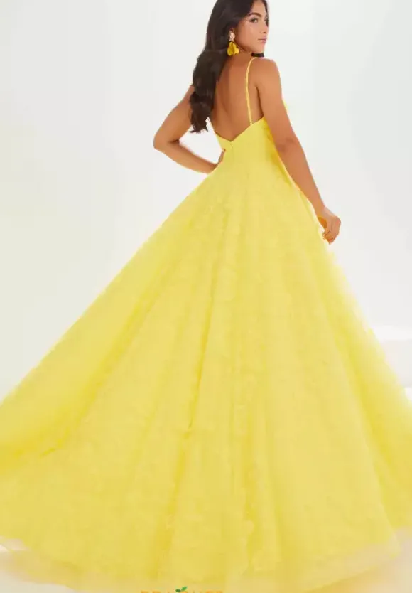 Look and feel like a modern day princess when you arrive to your event wearing this ravishing long dress 16034 by Tiffany. This lovely a line style showcases glittered floral designs that provide a subtle glow throughout the silhouette. The scoop neckline has thins straps that wrap into a modest open back. A train and slit are also featured.