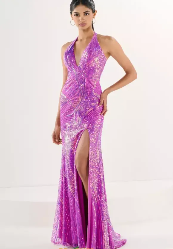 Be the star of the night in this dazzling long dress by Tiffany, style 16261. Featuring a halter deep V neckline, this gown is designed to draw all eyes to you. The bodice is flawlessly fitted and complemented by an alluring open back. The skirt is fully fitted and showcases a bold thigh high slit, while the entire dress is embellished with stunning hot stones for a radiant finish.