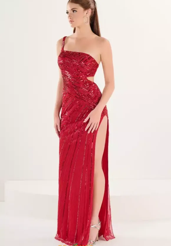 Show off your unique sense of style in this gorgeous one of a kind long fitted dress by Tiffany style number 16292. This fun and flirty dress features an asymmetrical single shoulder neckline and a sexy open back. The entire dress is covered in beautiful beadwork and sparkling sequins. The thigh high side slit adds the perfect final touch.