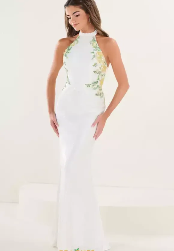 Make a statement walking into your special event wearing Tiffany long dress 16312. This figure flattening silhouette showcases a high halter neckline with an eye catching open back. A touch of floral applique is featured on the top half adding the perfect touch. The all over sequins will ensure to leave a lasting impression.