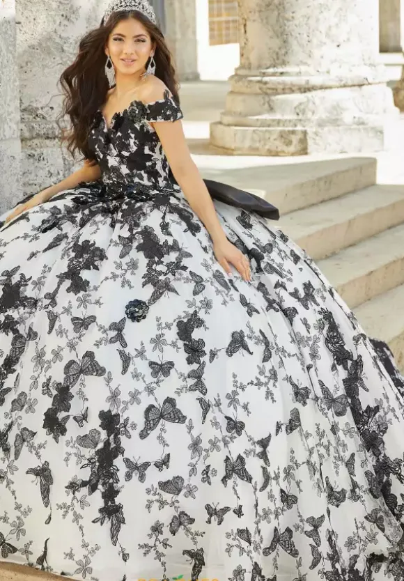 Have your own iconic moment in this fabulous butterfly print ball gown dress 26025 by Tiffany Quinceanera. The floral and butterfly printed skirt is absolutely enchanting and features a long skirt embellished with floral appliques to balance out this style. The fitted bodice features appliques along the sweetheart neckline and off the shoulder sleeves and the back features the timeless corset lace up along with an oversized bow.
