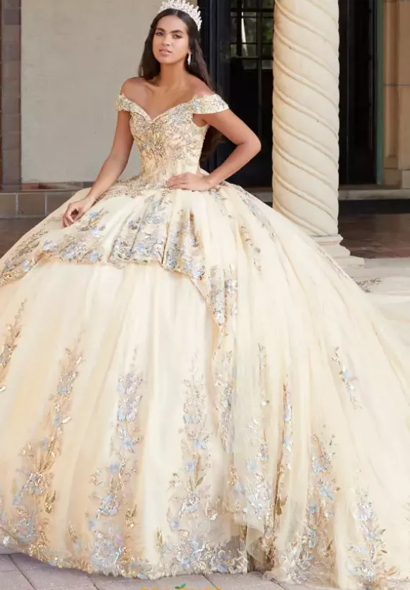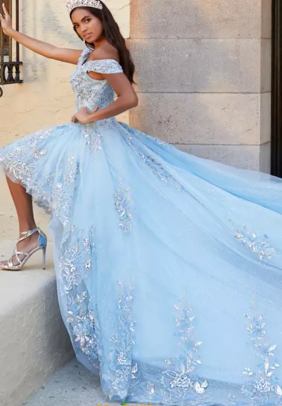 Get two looks in one with this astonishing Tiffany Quinceanera style 26058 that has a high low hem with a detachable ball gown skirt with a sweeping back train. This glamorous gown is embellished with large metallic floral appliques and crystal beading and showcases a fitted bodice with an off the shoulder portrait neckline and lace up tie back.