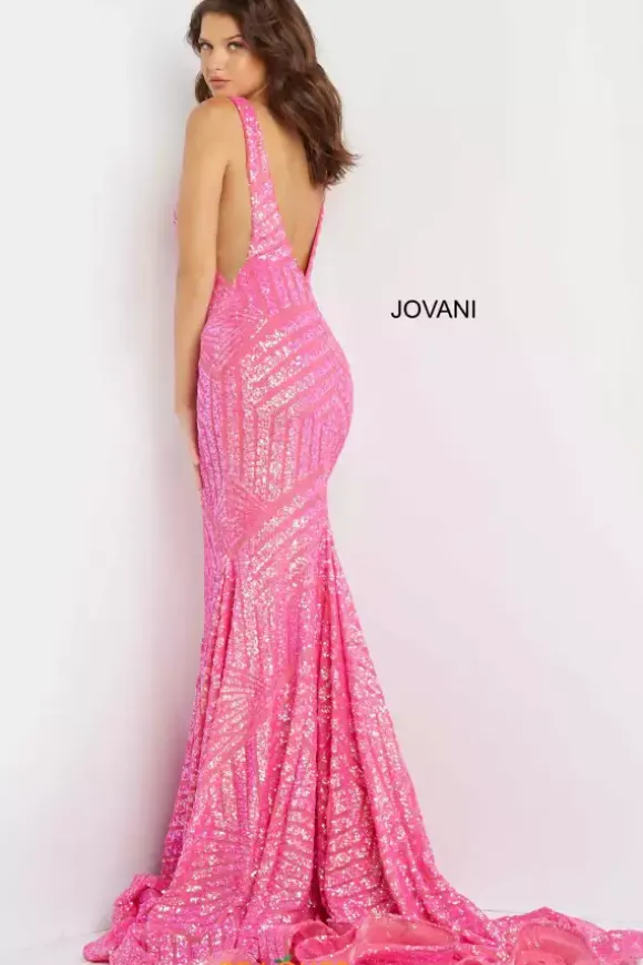 Sleek yet sexy is the way to go in this ultra glamorous Jovani dress style 59762. This fitted ensemble showcases a plunging V-cut neckline that gives you the ultimate touch of sexy. A geometric like beading pattern is featured throughout, as a long dramatic train cascades behind you. For more Jovani designs, check out Peaches Boutique in Chicago.