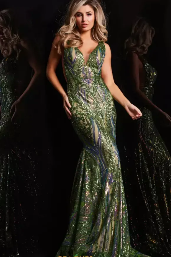 Make a head turning entrance when you light up the room in ultra sparkling long dress 22770 by Jovani. This dress is figure flattering and enhancing with a fitted cut that displays alluring details such as a V neckline, plunging side cutouts with mesh fabric for modesty, and a dramatic sweep train. A stunning combination of iridescent sequins and matching sequins adorn this dress from top to bottom revealing gorgeous and symmetrical beaded patterns that are guaranteed to have all eyes on you.