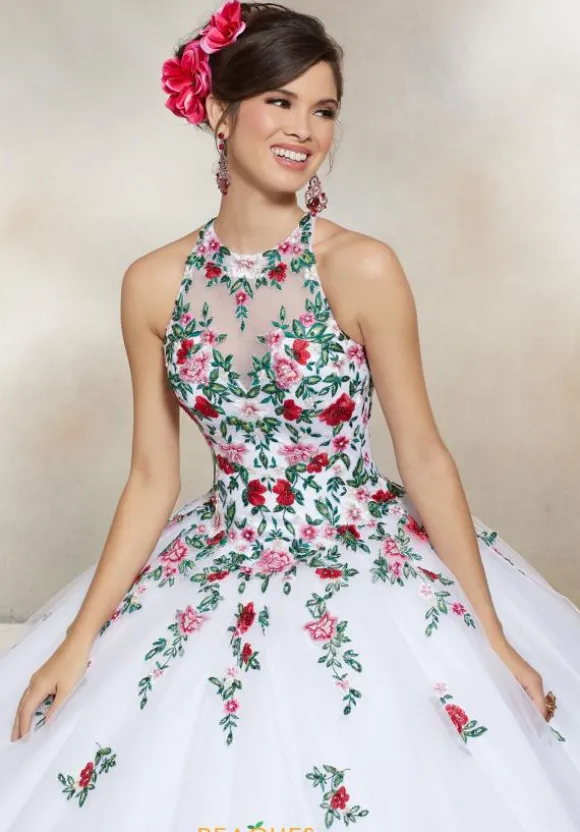 Dance all night long in this magnificent Valentina ball gown 34006. Versatile and dramatic, this astonishing dress features a high halter neckline and full tulle ball gown. Vivid floral appliques adorn the corset bodice, highlighting a gorgeous embroidery that cascades onto the entire silhouette for a glamorous effect.