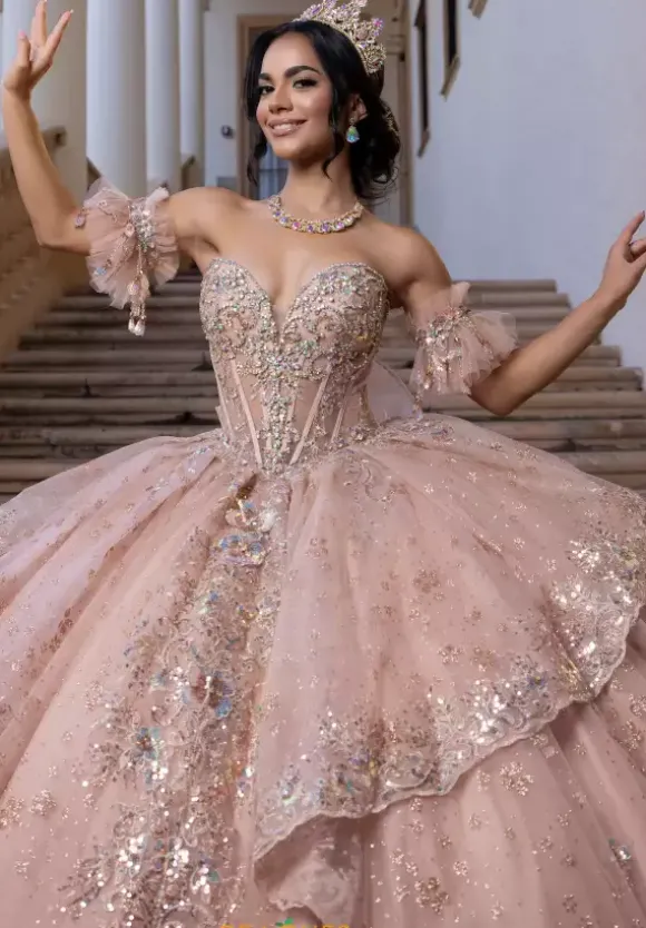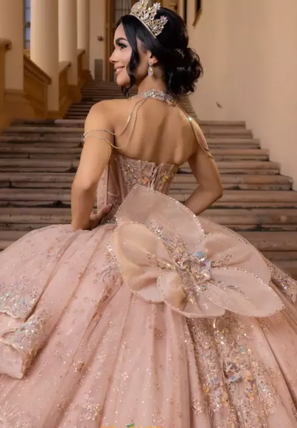 Glisten, sparkle and shimmer in this radiant Vizcaya Quinceanera ball gown style 4080002. The strapless sweetheart neckline showcases a drop waist bodice. Detachable crystal and pearl draped chocker matches the detachable off the shoulder sleeves. The dress is adorn in glittery appliques with a detachable flower back bow.
