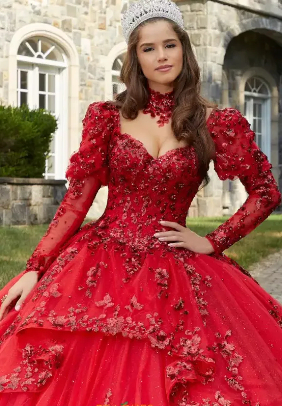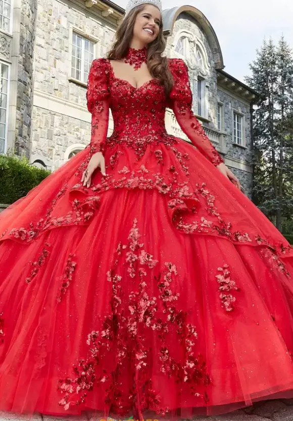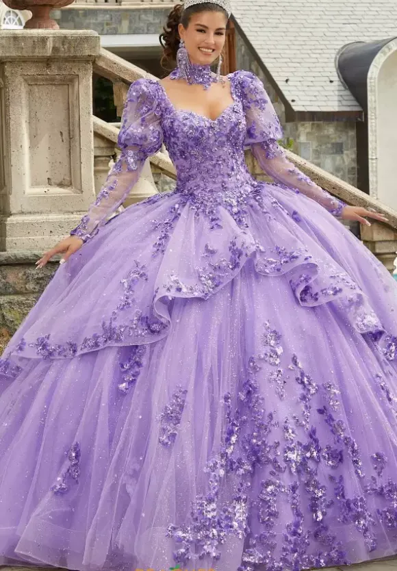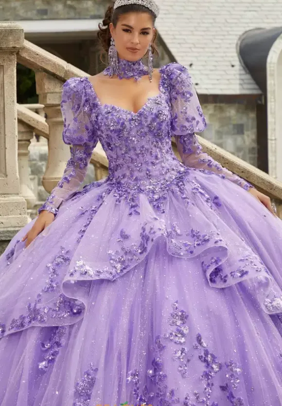 Stand out from the rest in one of a kind ball gown 60172 by Vizcaya. Featuring detachable long sleeves, matching choker, and detachable back bow, this dress is a must have. Stunning combinations of appliques and beadwork adorn the entire corset bodice and transition onto the voluminous ruffled tulle skirt.