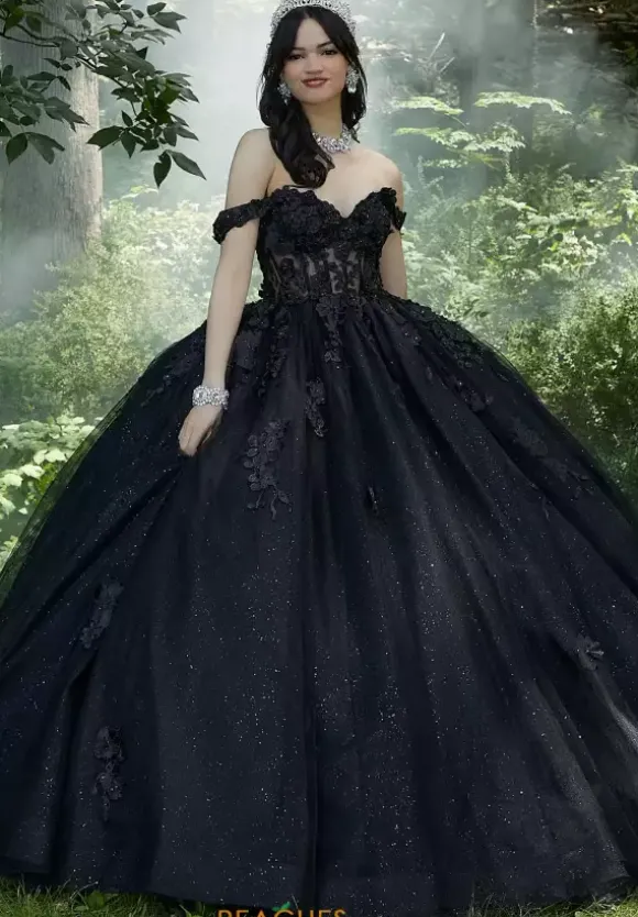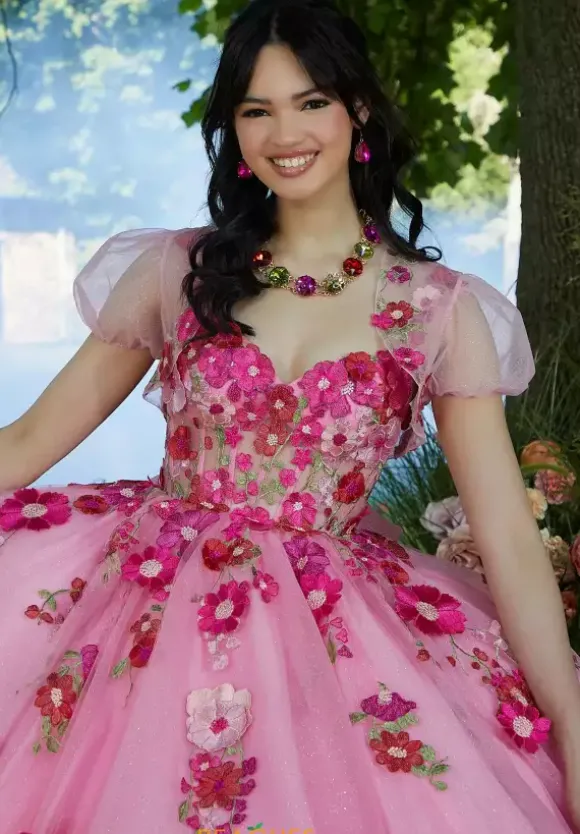 Make a lasting impression at your quince in this Vizcaya ball gown style 60197. The full tulle ball gown dress has a corset style bodice with off the shoulder cap sleeves. Floral lace appliques adorn the bodice and cascade down the small of your waist onto the skirt. A detachable back bow with floral lace and matching bolero included.