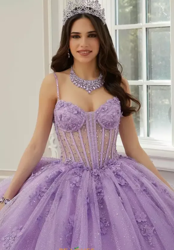 Feel and look beautiful on your special day wearing this show stopping Vizcaya long dress 60206. This fascinating gown showcases a v neckline with thin straps and built in corset sheer bodice. Glitter and applique adore the full skirt that will have everyone stop and stare. Finishing touches include a detachable bow, matching bolero jacket and sweep train.