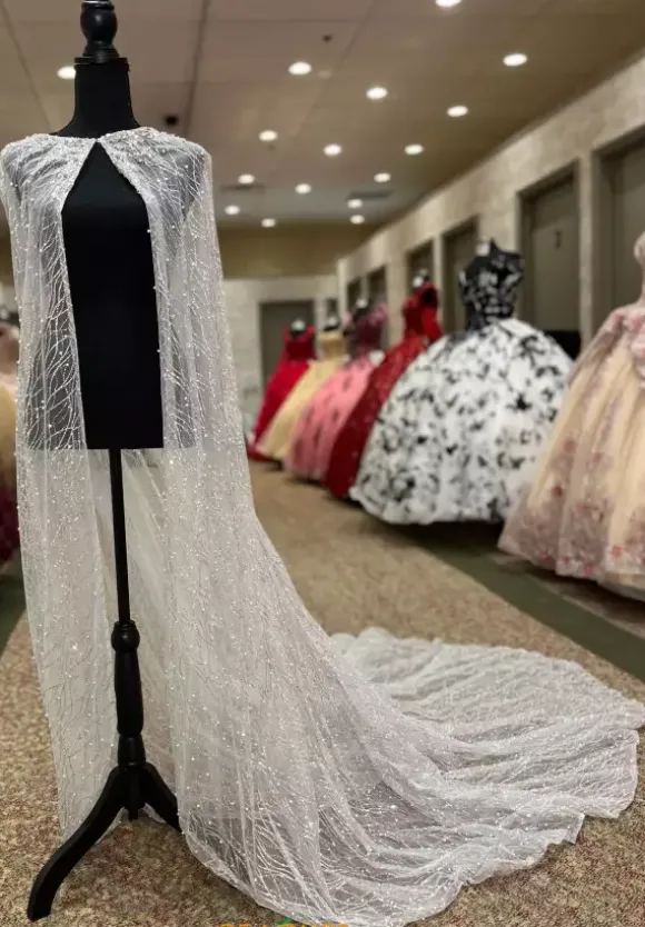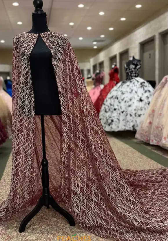 This beautiful long cape 89201 by Vizcaya is a lovely accessory and matches the 89199 Vizcaya ball gown. Perfect for church and it adds such a dramatic edge to your big day. Showcasing a glitter design throughout and impeccable bead work, you are sure to steal the show. Find more quinceanera accessories at Peaches Boutique today.