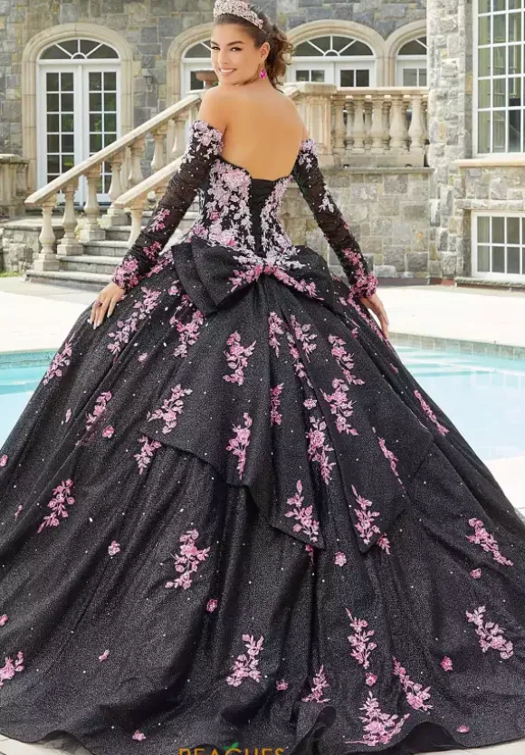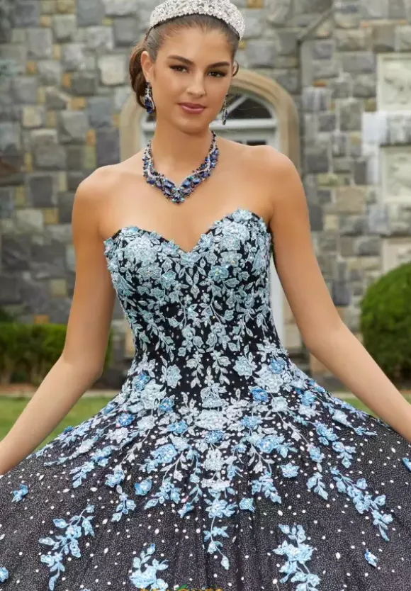 Dance the night away in jaw dropping ball gown 89415 by Vizcaya. The corset bodice is complimented by a sweetheart neckline and is fully adorned in contrasting beaded and embroidered details that make a gorgeous transition onto the voluminous glittering tulle skirt. The back of this dress displays a traditional lace up closure, sweep train, and detachable bow.