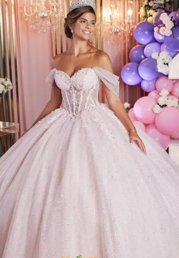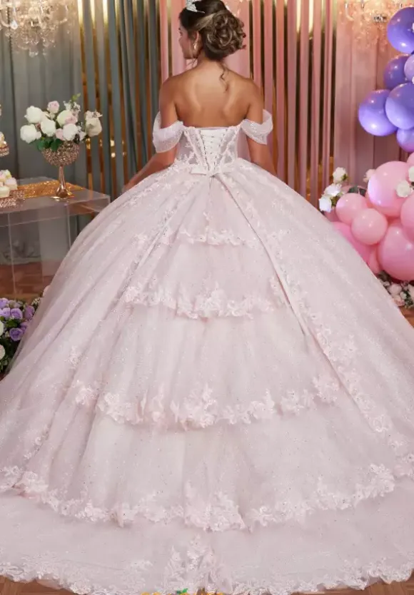 Radiate confidence in this stunning ball gown at your quince from Vizcaya style 89502. This glitter tulle ball gown dress showcases a long waisted corset bodice with off the shoulder cap sleeves. The sweetheart neckline is bedazzled with sparkling beadwork and the back has a lace up corset with a long layered train. Matching stole included.