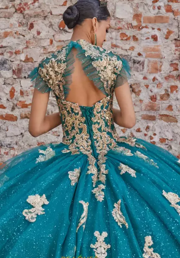 Feel like a modern day princess in this stunning ball gown from Vizcaya 89533. a must have choice for your special day this corset cap sleeve bodice is embellished with metallic gold appliques. The glitter tulle ball gown skirt continues those appliques as well as a detachable double loop bow.