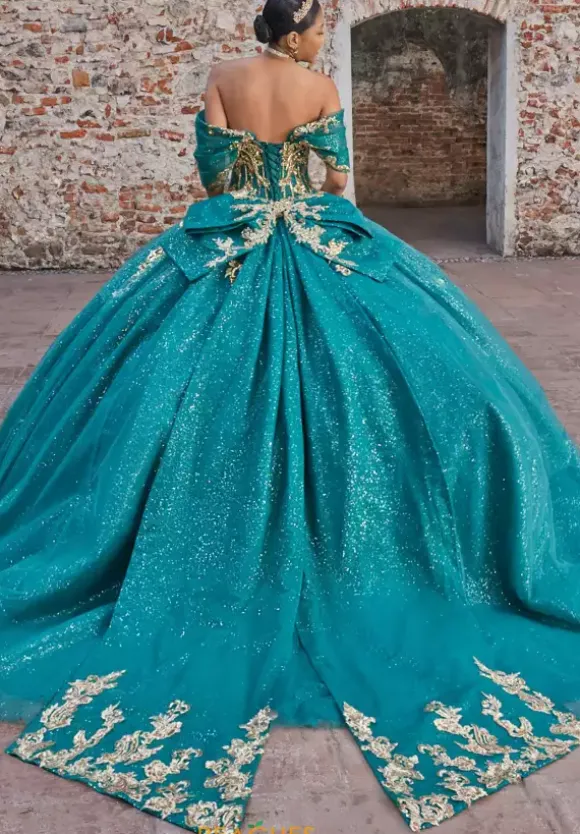 Put a smile on the audiences face as you walk into your next event wearing this long ball gown by Vizcaya style, 89535. Beautiful beaded applique corset accompanied with detachable off the shoulder sleeves having you feel your best. The voluminous skirt with dazzling glitter tulle starts at the waistline with an eye catching bow behind, flowing down into a long train.
