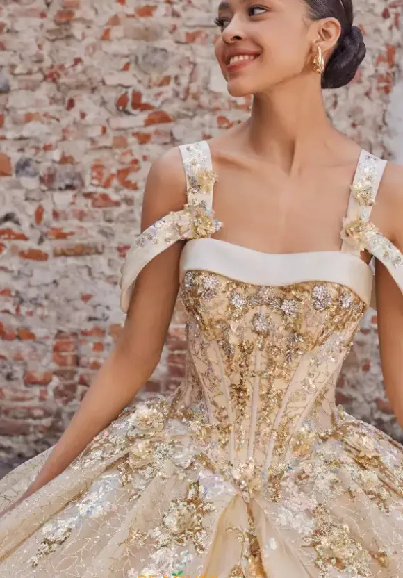 One night, one ballgown, a lifetime of memories, begin it all with the enchanting Vizcaya Quinceanera dress, style 89552. This truly captivating ballgown features an off-the-shoulder neckline with detachable cap sleeves, offering a timeless, lovely look. The bodice is beautifully adorned with delicate embroidery and shimmering beadwork, adding elegance. Sparkling sequin applique goes gracefully down the skirt, blending into layers of glitter tulle that create a radiant, show-stopping finish. An oversized elegant bow is attached to the back that flows just as long as the tulle, perfect for the most magical night of your life.