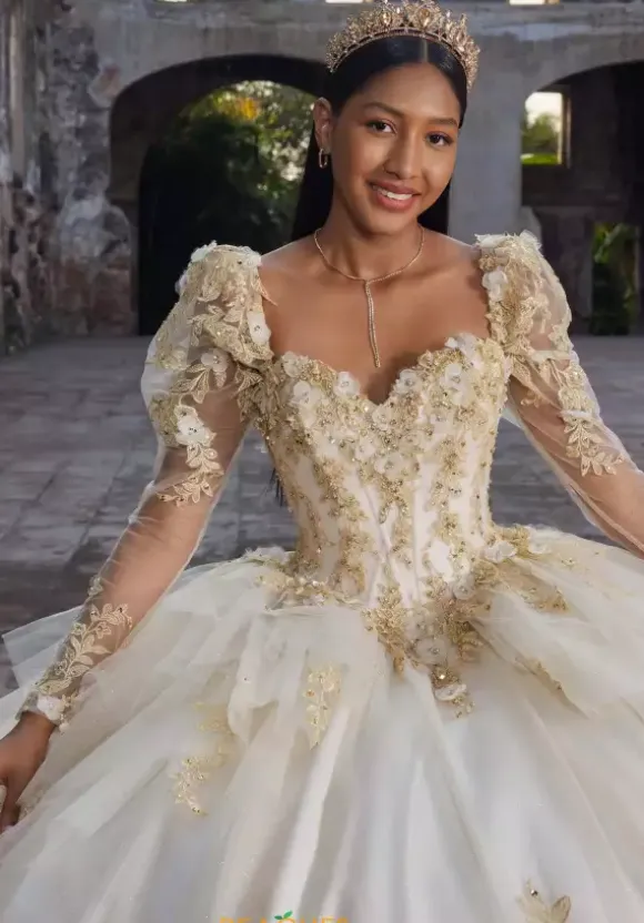 Step into a fairy tale in this breathtakingly dreamlike Vizcaya Quinceanera dress, style 89558. This mesmerizing ball gown features a strapless sweetheart neckline paired with detachable long sleeves adorned in delicate applique for a regal touch. Made from luxurious layers of glitter tulle and organza, the ball gown highlights bold applique accents across the corset, enhanced by intricate beadwork. And for a truly unforgettable finish, an oversized statement bow graces the back, making every exit as stunning as your entrance.