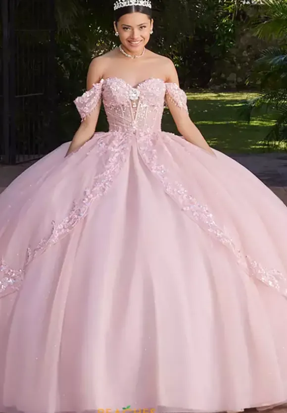 Show off your inner princess in this enchanting ballgown by Vizcaya Quinceanera, style 89561. Featuring a sweetheart neckline with draped, detachable off-the-shoulder sleeves, this gown radiates romantic elegance. The bodice is crafted from applique and adorned with delicate beading, giving it a timeless and luxurious feel. The skirt, made from glitter tulle, adds the perfect touch of sparkle. To complete the look, a dramatic, oversized bow at the back makes a jaw-dropping statement.