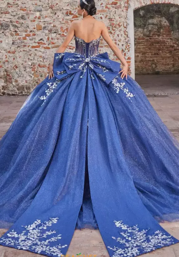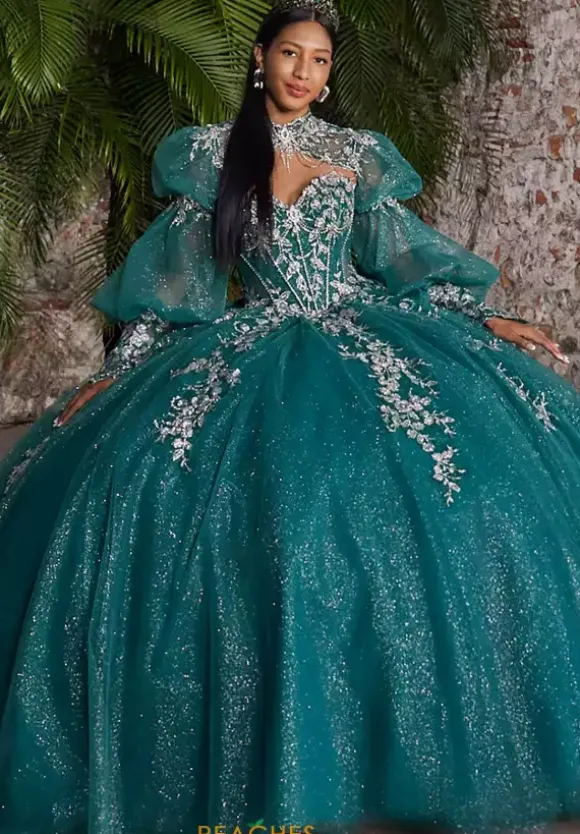 Be the spotlight of the night in this truly captivating ballgown by Vizcaya Quinceanera, style 89563. Featuring a endearing sweetheart neckline with off-the-shoulder straps exuding elegance. Bold beading paired with intricate applique adorns the corset and flows seamlessly into the long glitter tulle train. Completing the look, a dramatic bow cascades to match the length of the train. For an unforgettable entrance, a detachable high collar with scalloped detailing adds a regal touch that’s sure to leave everyone in awe as they see you.