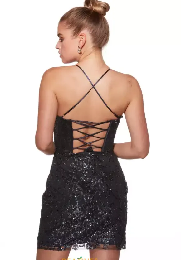 Shimmer, sparkle and glisten from all angles in this enchanting short fitted dress by Alyce Paris, style 40002. Featuring a sweetheart neckline and a cut out in the center with mesh for modesty. The dainty straps cascade into a crisscross at the back and a corset lace up. The glitter tulle adorned on this dress will ensure you are the star of the night.