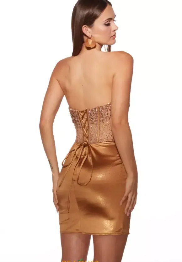 Be the hottest topic when you wear this seductive short fitted dress by Alyce Paris style 40122. The bodice has a alluring scoop strapless neckline that is followed by stunning beadwork. A lace up corset adds the perfect amount of elegance to the dress. Made in stretchy satin material for comfort all night long.