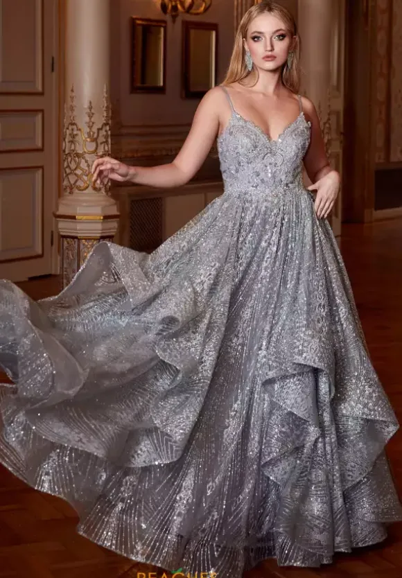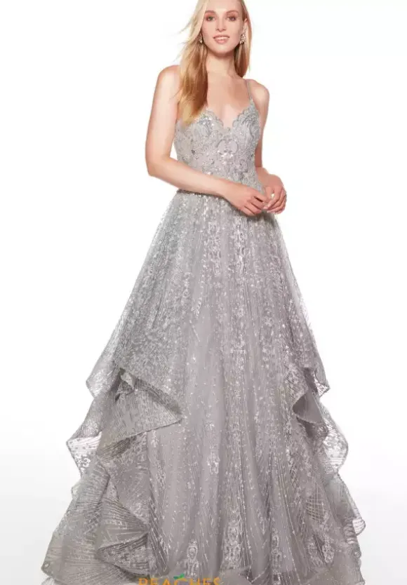 Shimmer and shine all night long at this years prom wearing this gorgeous long dress from Alyce Paris style 61295. Made of layers of tulle and glitter tulle and embellished with beads, this glistening gown features a v neckline bodice with spaghetti straps and lace up tie low open back. The long a line ball gown skirt is made of tiered layers with sparkling accents with a back sweep train.