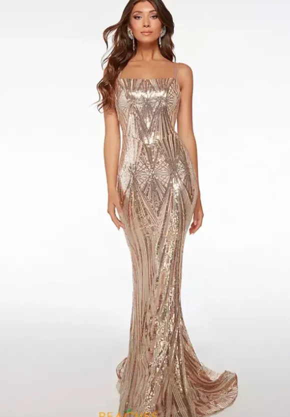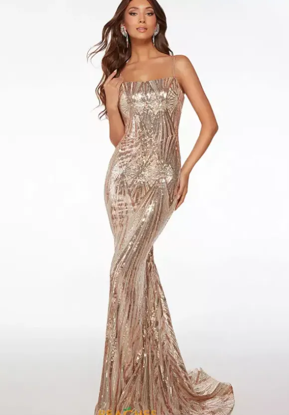 Be the golden girl at your event with this one of a kind fully beaded gold prom dress 61680 designed by Alyce Paris. The fitted adjustable bodice has double straps for support and a unique sequin beaded pattern adorns this dress from top to bottom for an everlasting gold sheen. This dress is completed with a sweep train.
