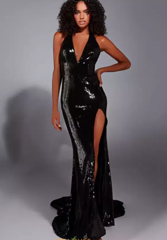 Strike a pose in this glamorous long dress by Alyce Paris, style 61772. Showcasing a fitted silhouette with a plunging v halter neckline. This number is fully adorned with glistening sequins and dazzling beadwork thats sure to have you sparkle all night long. An open back with a thigh high slit are perfect final touches.